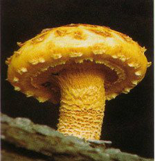 黃傘子實體色澤鮮艷呈金黃色,菌蓋菌柄上布滿黃褐色鱗片。該菇富含蛋白質、碳水化合物、維生素及多種礦物質元素,食之黏滑爽口,味道鮮美,風味獨特。該菇菌蓋上有一種特殊的黏液,據生化分析表明,這種物質是一種核酸,對人體精力、腦力的恢復有良好效果。黃傘是一種中低溫型食用菌,生產工藝簡單,產量較高,市場售價較好,是大有發展前途的食用菌新品種之一。 黃傘子實體單生或叢生,菌蓋直徑5-12厘米,初期半球形邊緣常內卷,后漸平展,有一層粘液;蓋面色澤金黃至黃褐色,附有褐色近似平狀的鱗片,中央較密。菌肉白色或淡黃色。菌褶直生密集,淺黃色至銹褐色,直生或近彎生,稍密。菌柄纖維質長5-15厘米,粗1-3厘米,圓柱形,有白色或褐色反卷的鱗片稍粘,下部常彎曲。菌環淡黃色,毛狀,膜質,生于菌柄上部,易脫落。孢子橢圓形,光滑,銹色,7.5-10微米×5-6.5微米。菌絲初期白色,逐漸濃密,生理成熟時分泌黃褐色素。